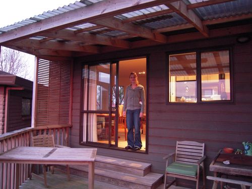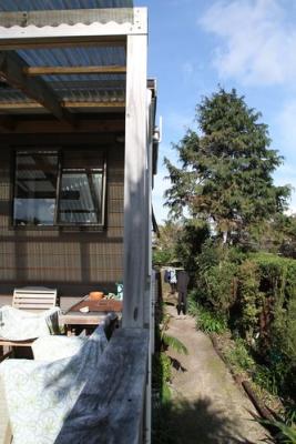 Terasse und Gartenstreifen, hinten hängt der Neoprenanzug auffe Leine