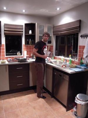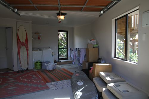 Der "Lagerraum" mit Waschmaschiene, jeder Menge Platz für Fahrräder und Gitarren, die aber ja nicht da sind. Statt dessen lagern hier Surfboard, die Campinguntensilien für die Wochenenden, Wein und Bier und frisch gewaschene Wäsche :)