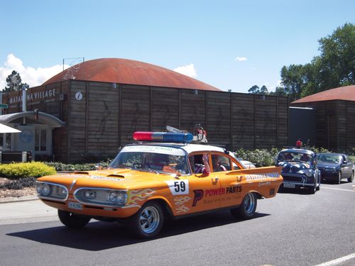 Spendensammlerrallye für die Kinder im zerstörten Christchurch. Im Hintergrund kann man das Kino von Matakana sehen. Interessantes Gebäude mit 2 Cortenstahlkuppeln.