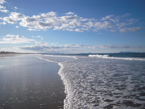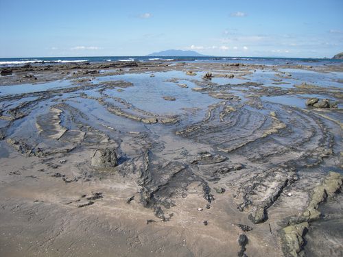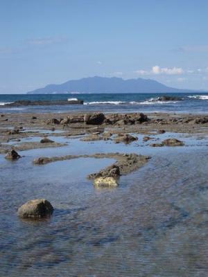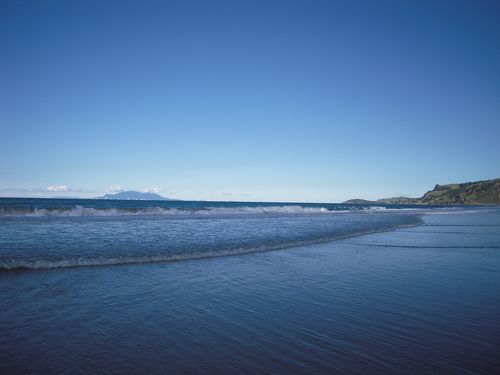 Blick von Pakiri Beach auf eine Insel, die wie ein Krokodil aussieht