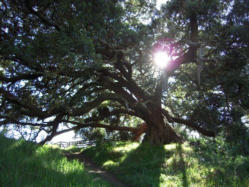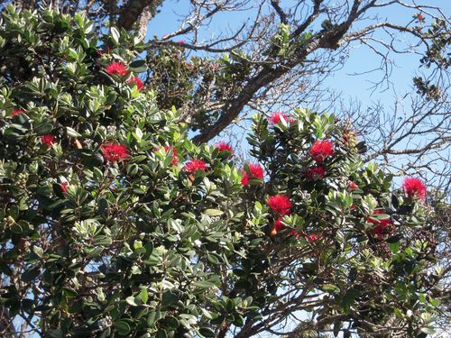 Ein spät blühender Pohutukawa-Baum. Die blühen hier normalerweise um Weihnachten rum, weshalb man sie auch den Neuseeländischen Weihnachtsbaum nennt.