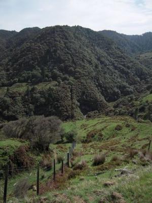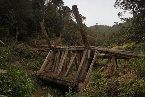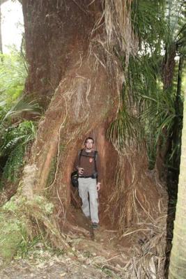 Ein Kauridamm, hier haben vor hundertundwas Jahren eiserne Männer die schönen Baumriesen gefällt. Und weil die zu groß zum Abtransportieren waren, wurde mit einem Damm eine große Menge Wasser angestaut, mit der die dicken Baumstämme dann zu Tale geflossen sind.
