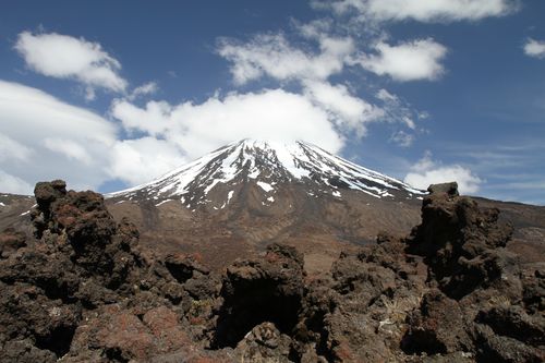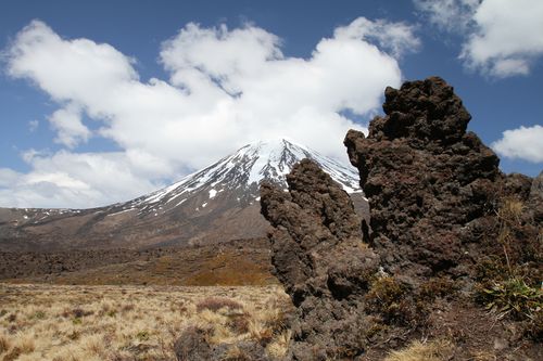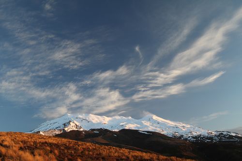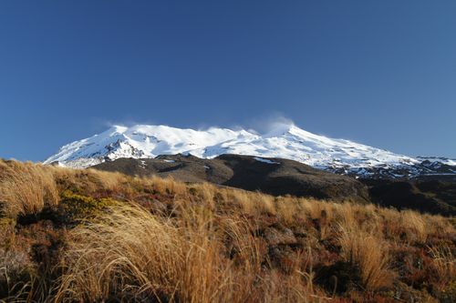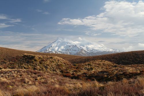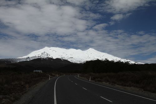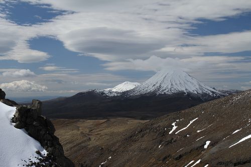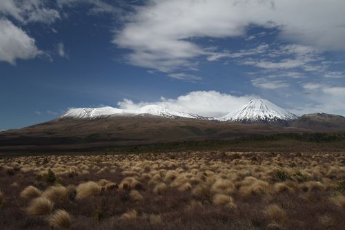 Im Herzen des Tongariro Nationalparks liegen Mt. Tongariro links und Mt. Ngauruhoe (Schicksalsberg aus Herr der Ringe), in der Nacht zuvor frisch beschneit.