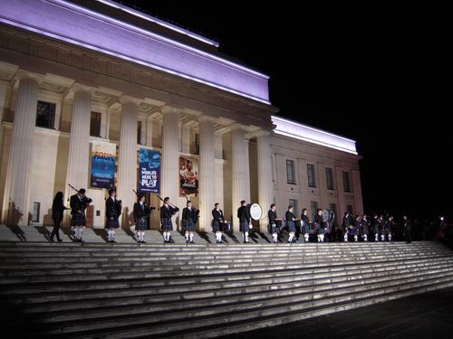 Pipes vor dem Museum - alle haben darauf gewartet, dass die Jungs und Mädels loslegen, aber passiert ist nix. Ein Mensch vom Fernsehen hat uns aufgeklärt: Vor ein paar Wochen ist das Dudelsackspiel schon aufgezeichnet worden, und damit das simultan zum Feuerwerk abläuft ist das dann ins Liveprogramm eingespeist worden. Also ham die Dudelsäckler sich nur von ein paar hundert Leuten hingestellt und so getan als ob.